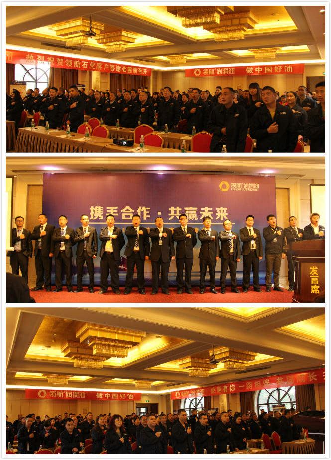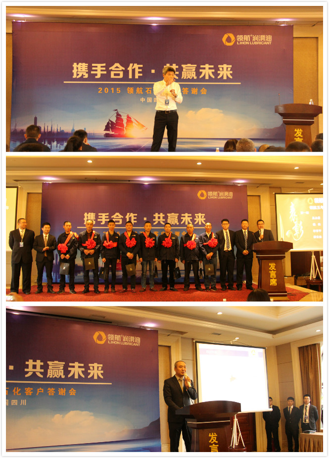 2015年10月28日,成都,由領(lǐng)航潤滑油四川分公司主辦的四川區(qū)域優(yōu)秀客戶答謝會在金碧輝煌的新皇城大酒店宴會廳盛大召開,領(lǐng)航潤滑油的近兩百名合作伙伴統(tǒng)一穿著領(lǐng)航的工作服出席,進行了一場回顧、總結(jié)、展望、感恩為主題的盛宴。