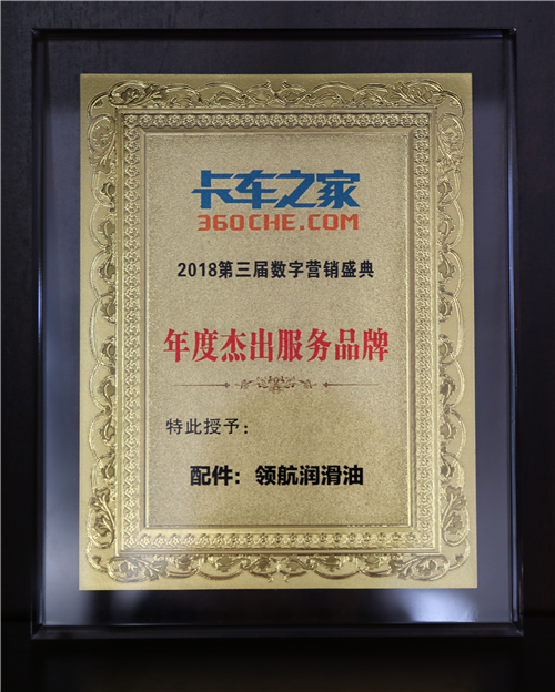 2018年1月17日,由卡車之家舉辦的“我是誰 千人千面 個(gè)體發(fā)現(xiàn)”第三屆數(shù)字營銷盛典在北京燕莎中心凱賓斯基酒店隆重舉行,領(lǐng)航潤滑油獲得了本次數(shù)字營銷盛典2017年度杰出服務(wù)品牌。