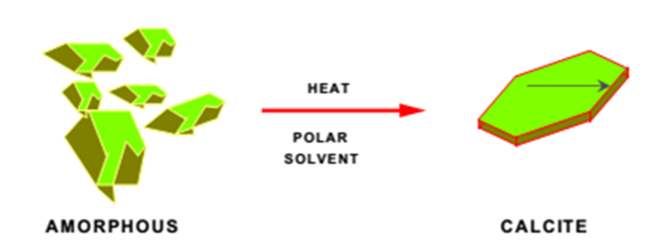 由無(wú)定形碳酸鈣在強(qiáng)極性轉(zhuǎn)化劑的作用下,無(wú)定型磺酸鈣會(huì)從膠束中游離出來(lái)去包裹轉(zhuǎn)化劑,原來(lái)穩(wěn)定的穩(wěn)定膠束體系失去平衡,其中無(wú)定型碳酸鈣從膠束中游離出來(lái),在轉(zhuǎn)化劑的綜合作用下聚結(jié)成方解石狀晶體。